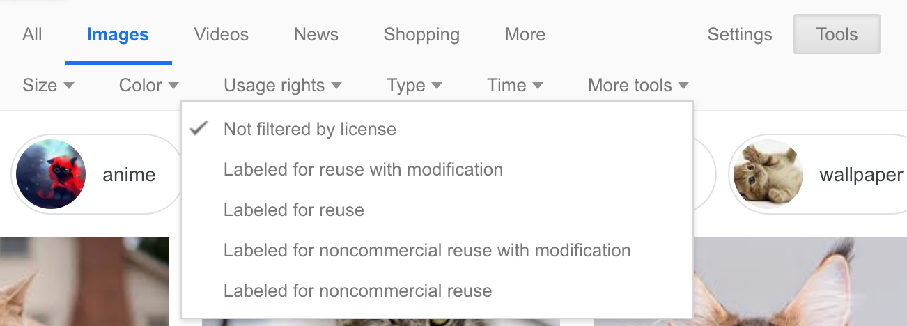You can also search Google for reusable images, although I’m a wee bit distrustful of this, and recommend you double and triple check before using anything you find via Google Image Search. To use Google Image Search, do your search, click on ‘Tools’, select ‘Usage Rights’ and go for ‘Labelled for reuse with modification’. It’s not perfect – which is why you need to check the webpage for the explicit licence – but it’s not bad.